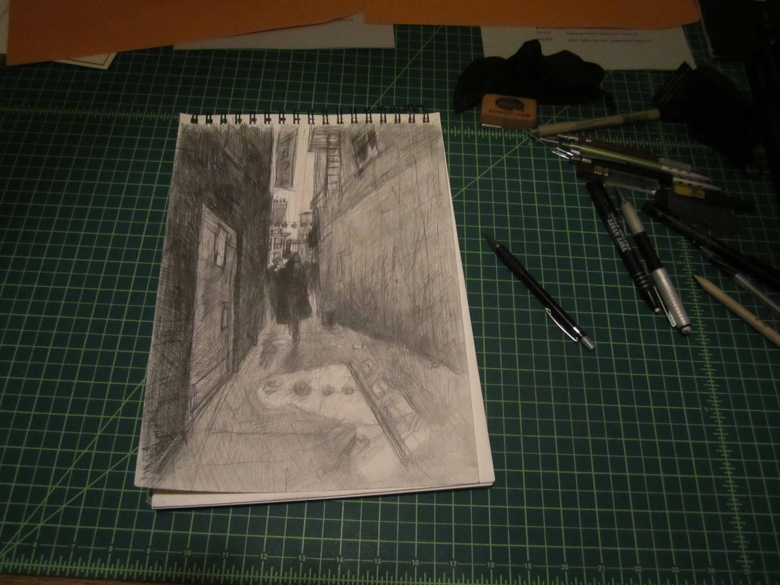 Gino Carlo on the other hand is just an extreme point of view without the fisheye effect. It has it's own set of challenges. The victorian features of the building at this extreme perspective are very challenging to capture. I would have liked to been able to collage my photos of the building together in photoshop prior to starting this piece, but the perspectives of the photos varied greatly. I picked the photo with my favorite angle and I've just gone for it referencing all five to seven shots.